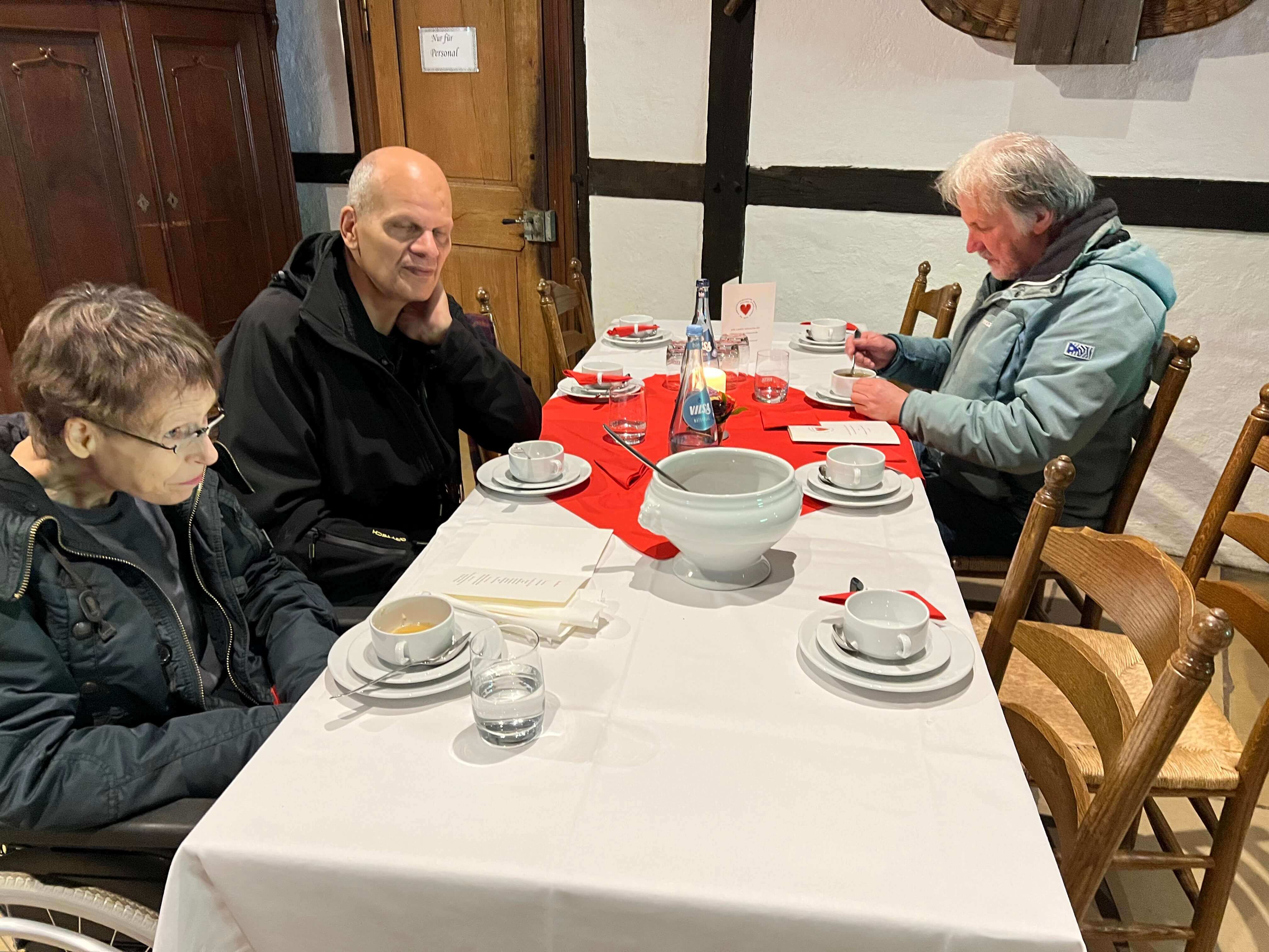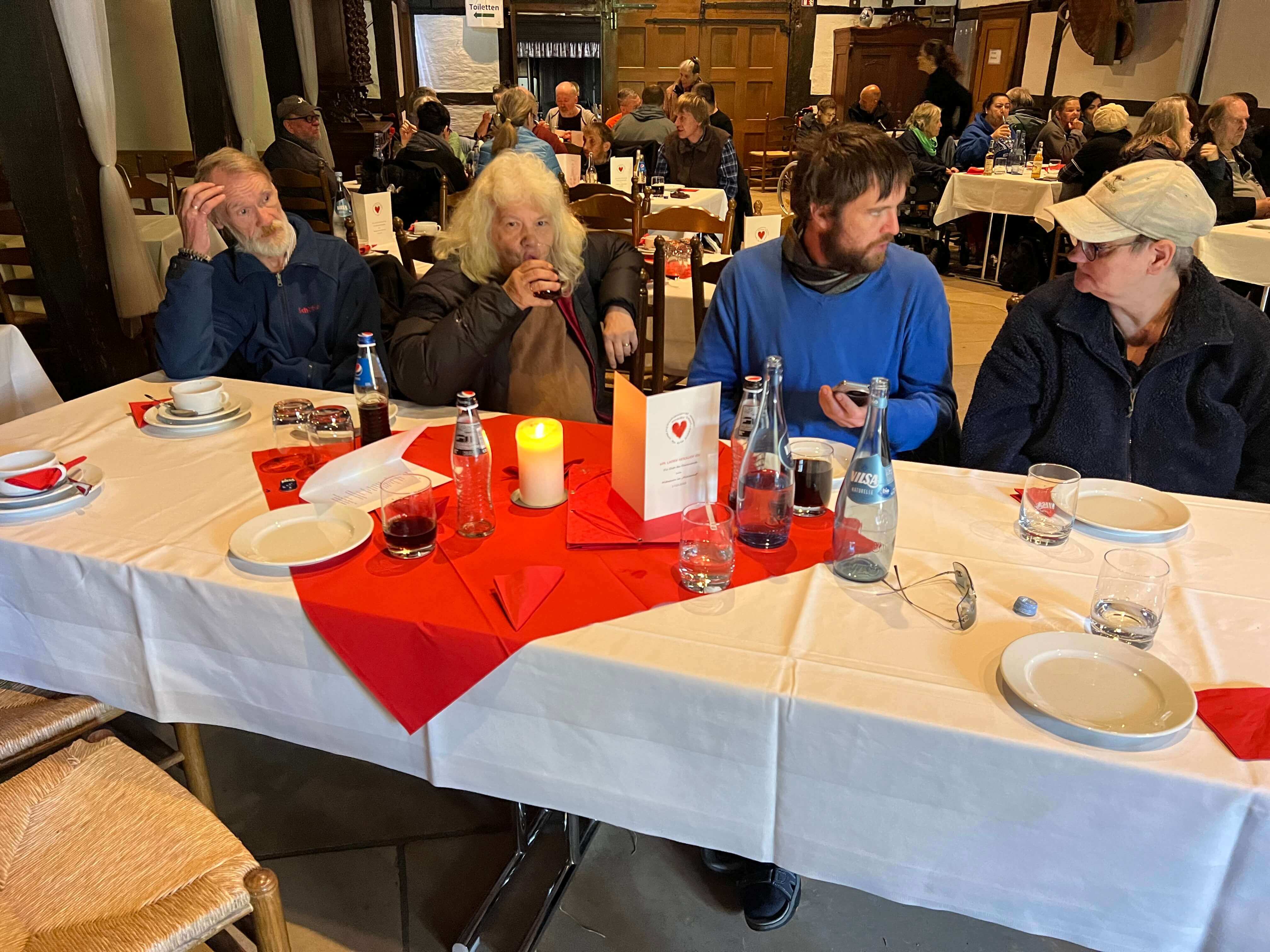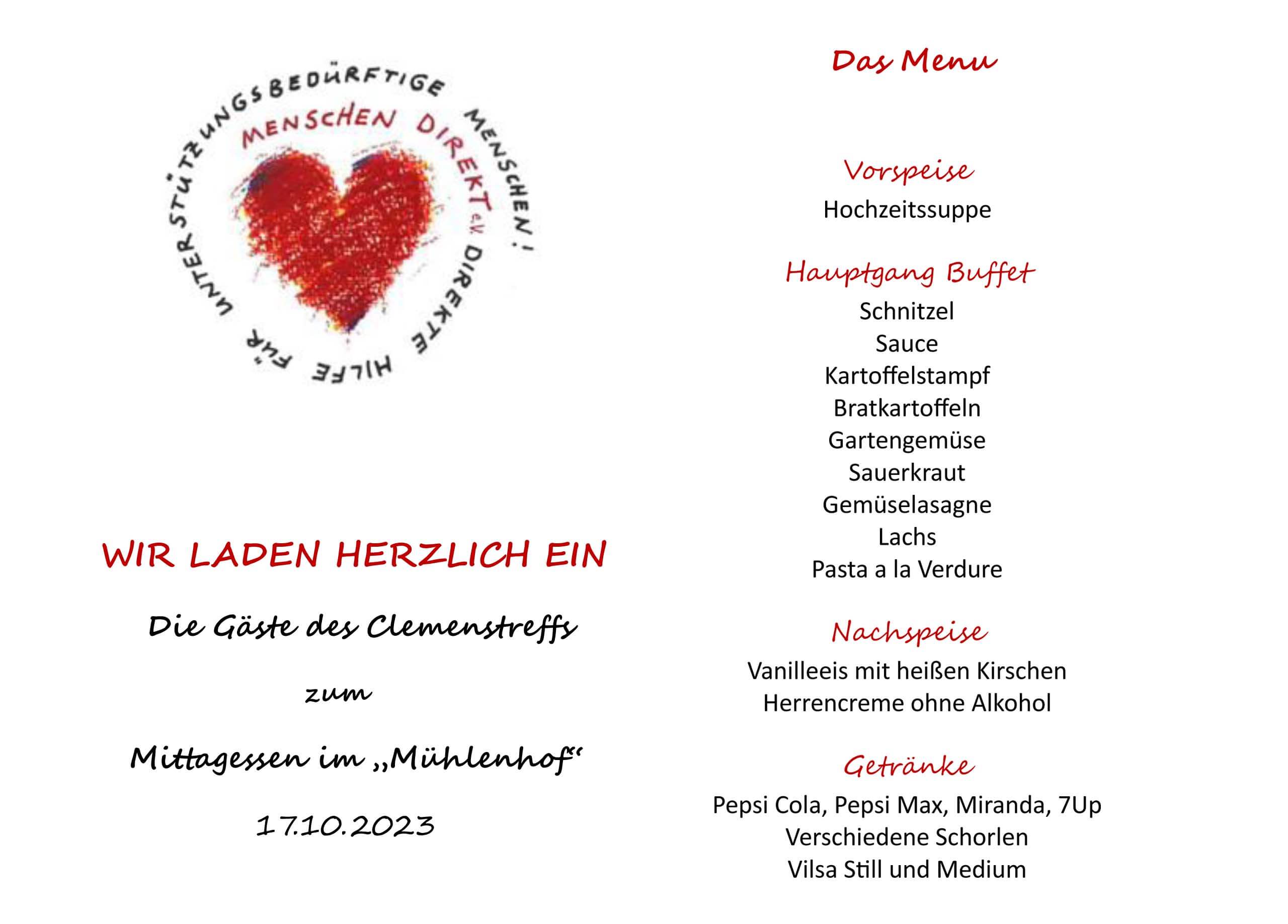 Zu einem großen Mittags-Buffet lud der Verein MENSCHEN DIREKT die Gäste aus dem Treffpunkt "An der Clemenskirche" am 17. Oktober 2023 auf das Gelände des Mühlenhofes - Freilichtmuseum am Aasee - in Münster ein. Der Treffpunkt "An der Clemenskirche" wird als Aufenthaltsmöglichkeit von Menschen in sozialer Not genutzt. Hilfsbedürftige Menschen finden hier Zuflucht, eine warme Mahlzeit und viele andere Hilfen und Unterstützung auf ihrem ganz eigenen Weg.